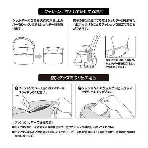 日常使いのシーンではデスクワーク時の腰当クッションや寝室の枕として、災害時にはショルダー紐で両手を開けて避難することができます。